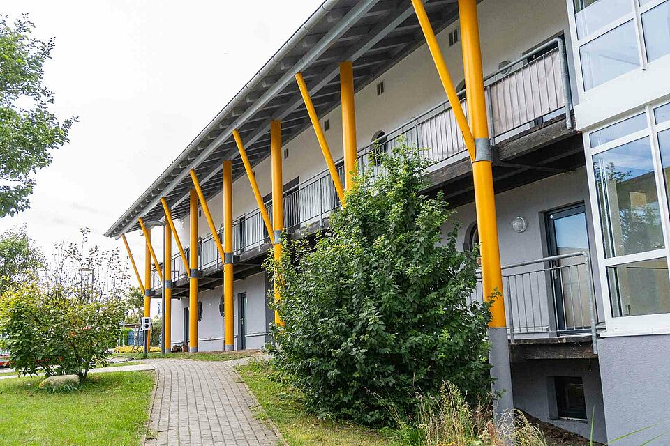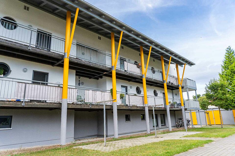 Die Wohnanlage wurde 1998 eröffnet und umfasst 16 Zwei-Raum-Wohnungen mit Wohnflächen zwischen 50 und 55 Quadratmetern. In dem Laubenganghaus verfügt jede Wohnung über einen direkten Zugang ins Freie. Von den oberen Laubengängen genießen Sie einen schönen Blick auf den Greifswalder Bodden.